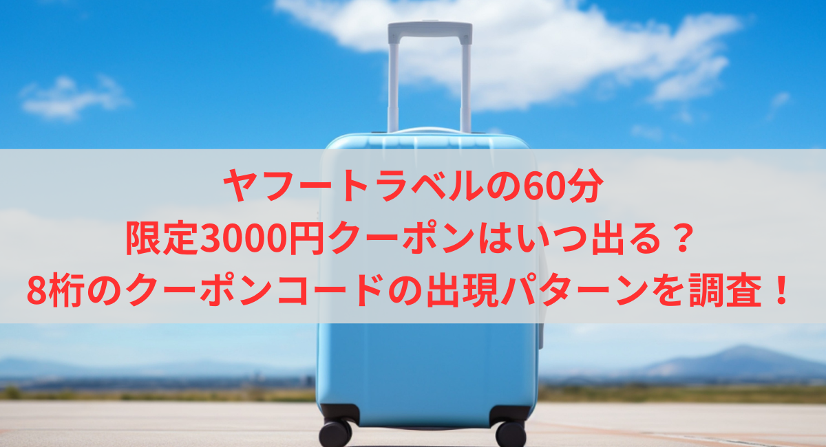 ヤフートラベル ヤフートラベルの3000円クーポン(60分限定)はいつ出る?8桁のクーポンコードの出現パターンを徹底調査! この記事は、ヤフートラベルの3000円クーポン(60分限定)はいつ出るかなどを紹介しています。 ヤフートラベルの60分限定の3000円の8桁のクーポンコードは、予約金額が40000円以上の場合から使えるものが多いです。 ただし、60分限... 2023.08.21 ヤフートラベル